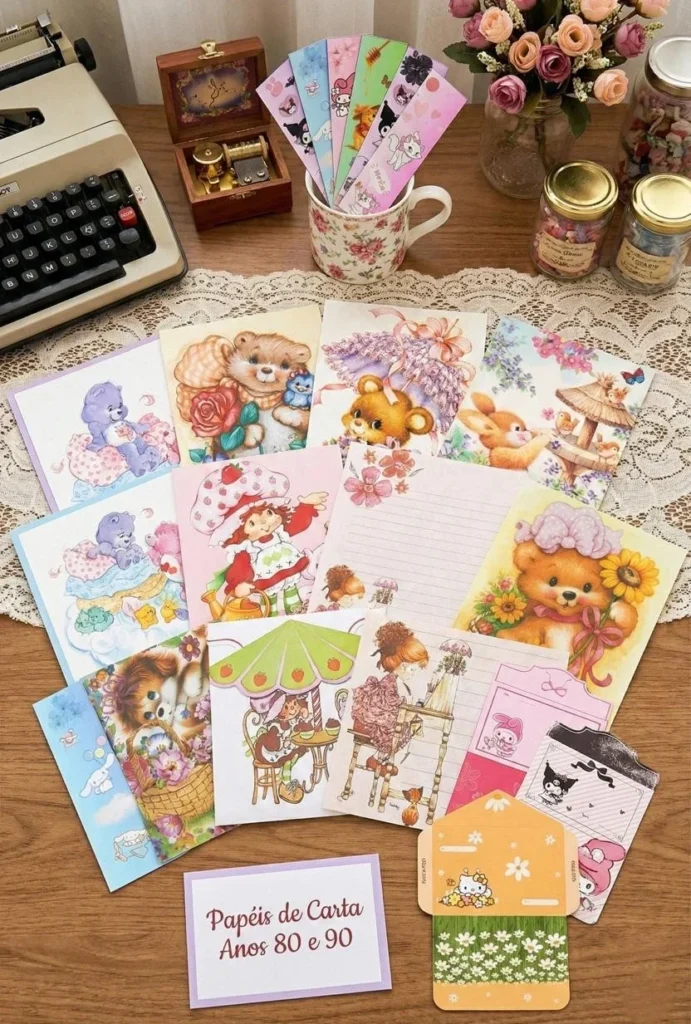 Papéis de carta inspirados nos anos 80 e 90 para imprimir, colecionar e reviver memórias que nunca saem de moda. 💌✨